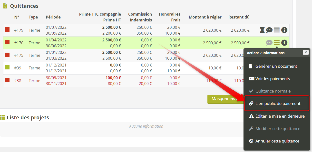 Certains clients n’ont peut-être pas d’accès à l’extranet client Modulr, mais ils souhaitent pouvoir vous régler leurs quittances par CB. Vous pouvez leur envoyer un lien vers une page de paiement publique (ne nécessitant pas d’accès à Modulr). Vous pouvez récupérer depuis le menu “3 barres” de la quittance :
