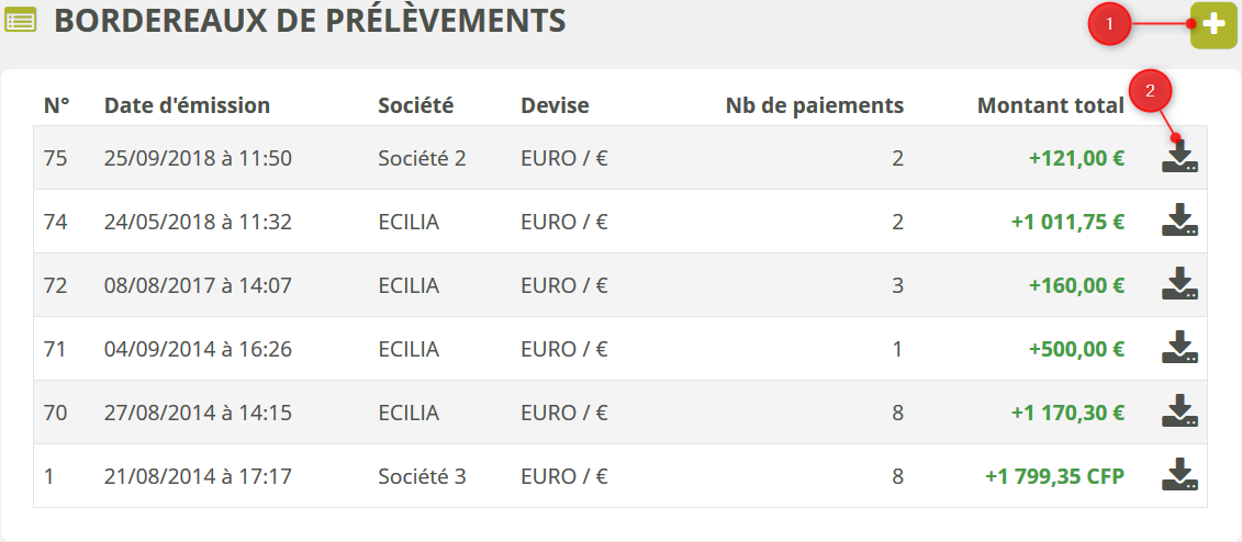La liste des bordereaux de prélèvements vous permet de retrouver l'historique des bordereaux générés. À partir de cette liste vous pouvez :