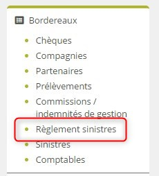 Vous accédez à la gestion des bordereaux de règlements de sinistres depuis le menu de gauche :