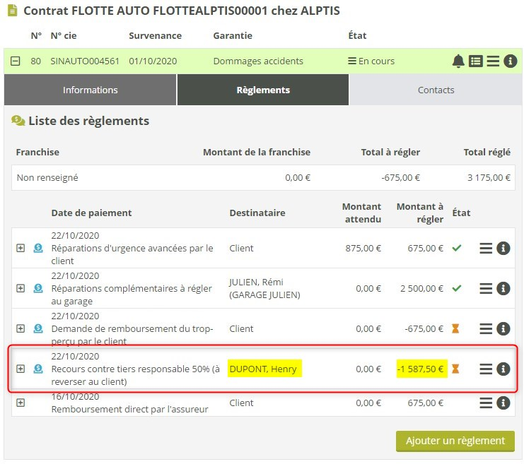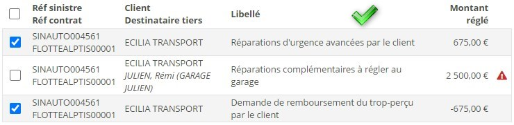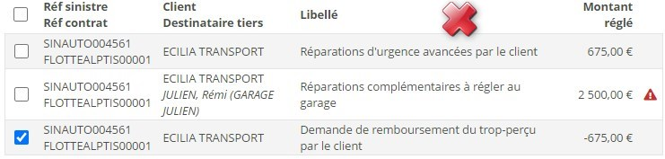 Un règlement négatif peut être compensé par des règlements d’autres sinistres, à condition qu’ils concernent des contrats de même type et le même client. Ainsi, un règlement sur le sinistre d’un contrat PJ ne pourra pas compenser un règlement négatif sur le sinistre d’un contrat Auto.