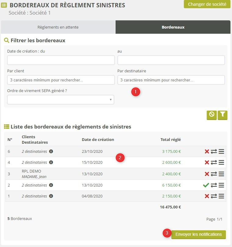 Onglet bordereaux : gérer les bordereaux existants et notifier les destinataires