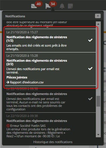 L’état d’envoi des notifications par email aux différents destinataires : si un seul destinataire n’a pas pu recevoir d’email, une croix rouge est affichée, sinon une coche verte.