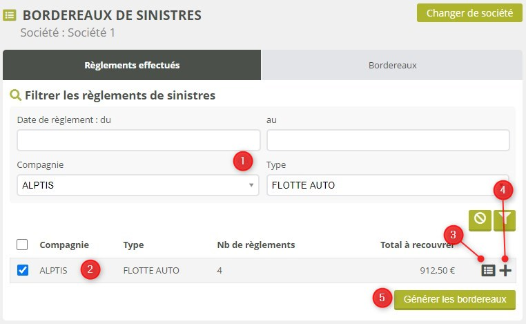 Un bordereau de sinistres est une dette de l’assureur envers vous. En tant que telle, il faut la solder. Cela consiste à insérer dans la fiche compagnie des paiements pour remboursement de sinistres, et à les affecter aux bordereaux impayés.