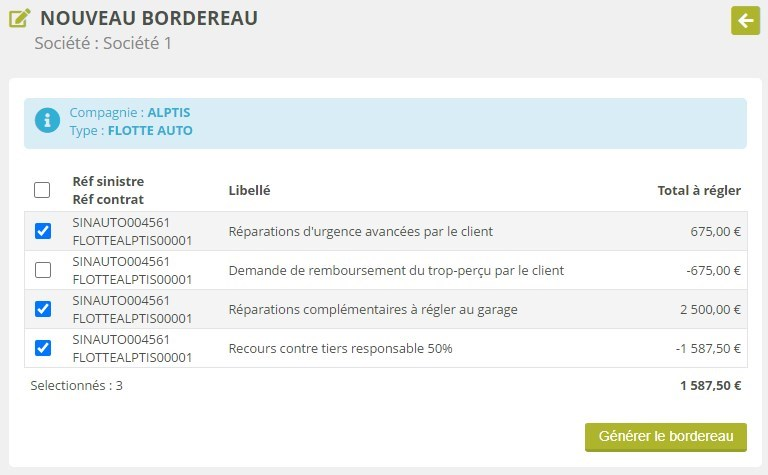 Il est tout à fait possible de générer un bordereau de sinistres négatifs, c’est-à-dire dont le total des règlements est négatif. Cela signifie que vous devrez rembourser la somme correspondante à l’assureur. Ce cas de figure dispose d’actions de menu spécifiques pour faciliter le paiement par virement SEPA (voir plus bas).