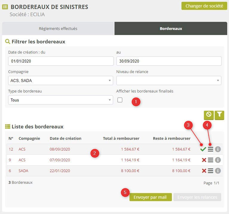 Filtrez vos bordereaux. Notamment, le filtre « Afficher les bordereaux finalisés » permet d’afficher les bordereaux qui ont été intégralement payés par la compagnie. Par défaut ils sont masqués pour ne pas surcharger l’affichage.