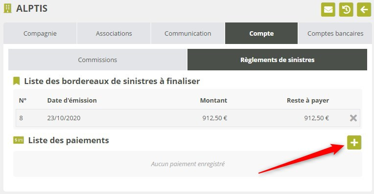Depuis l’onglet Compte de la fiche compagnie, rendez-vous dans l’onglet « Règlements de sinistres » et ajoutez un nouveau paiement :