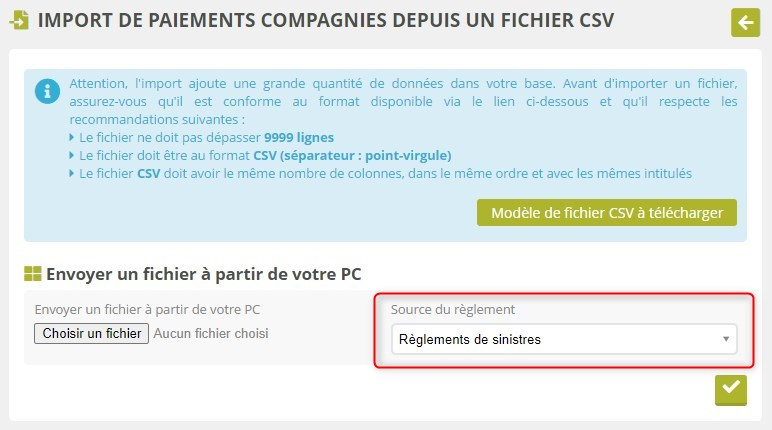Depuis la section « Imports », utilisez « Import de paiements compagnie par fichier CSV » :