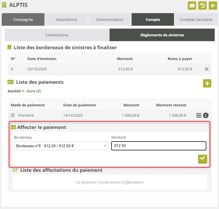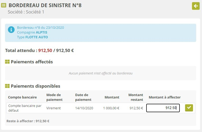 Note : un paiement compagnie ne peut être affecté qu’une seule fois au même bordereau, il n’est pas possible d’affecter le même paiement au même bordereau en plusieurs affectations partielles.