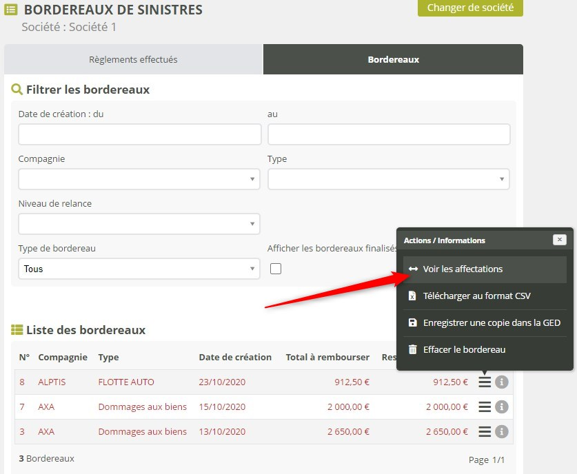 Depuis la liste des bordereaux de sinistres, ouvrez le menu d’actions du bordereau à solder, et cliquez sur Voir les affectations :