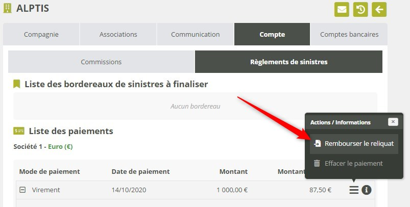 Le reliquat d’un paiement compagnie peut lui être remboursé : depuis l’onglet Compte de la fiche compagnie, ouvrez le menu d’actions du paiement et cliquez sur « Rembourser le reliquat » :