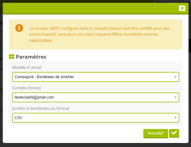 Sur validation, Modulr génère un email par bordereau sur chaque fiche compagnie pour laquelle un bordereau non envoyé est affiché à l’écran (ceux avec un avertissement ou une croix rouge en bout de ligne). Chaque email reçoit en pièce jointe le bordereau correspondant dans le format spécifié.
