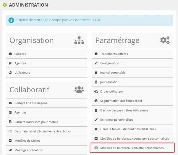 Vous pouvez modifier le modèle utilisé par défaut pours les bordereaux de sinistres de toutes les compagnies, mais vous pouvez également définir un modèle personnalisé pour chaque compagnie. Pour le faire, rendez-vous dans la page d’administration, et cliquez sur « Modèles de bordereaux de sinistres personnalisés »