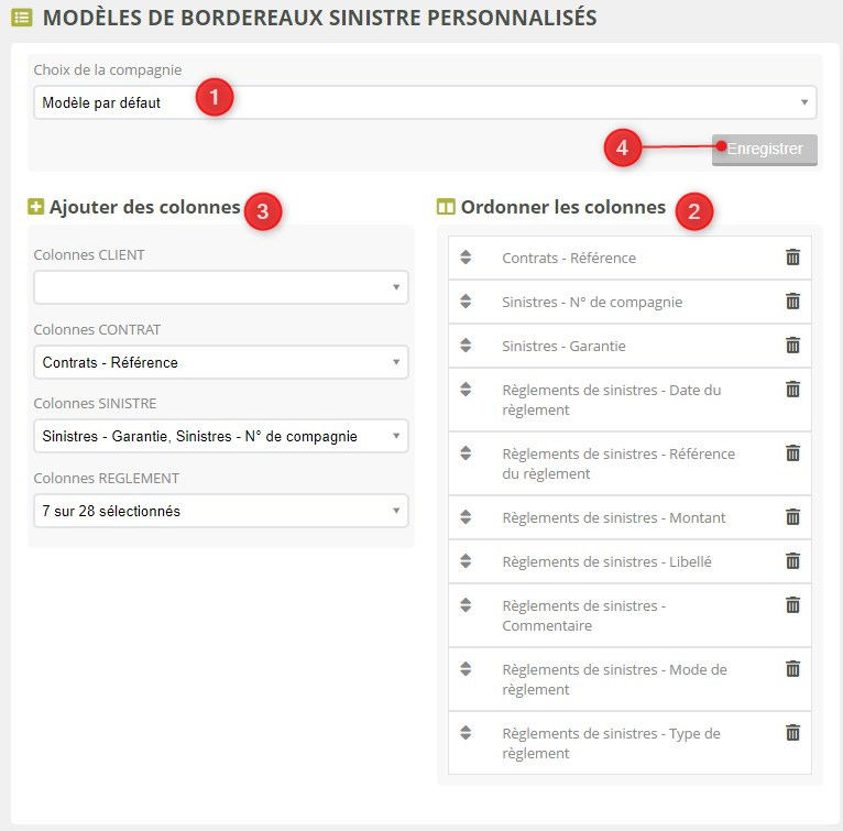 3. « Ajouter des colonnes » : pour ajouter des colonnes au modèle vous disposez de plusieurs listes de valeurs parmi les données du client, du contrat, du sinistre et du règlement. Les colonnes déjà dans le modèle apparaissent cochées. Pour ajouter une colonne, cliquez simplement sur son nom : la colonne apparaîtra en dernière position dans le modèle ; vous pouvez alors la repositionner où vous le souhaitez par glisser-déposer.