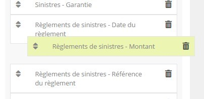 2. « Ordonner les colonnes » : affiche la liste des colonnes qui composent le modèle chargé. L’icône poubelle retire la colonne. Les colonnes affichées dans cette liste correspondent, de haut en bas, aux colonnes du fichier CSV de gauche à droite. Vous pouvez modifier cet ordre par glisser-déposer :