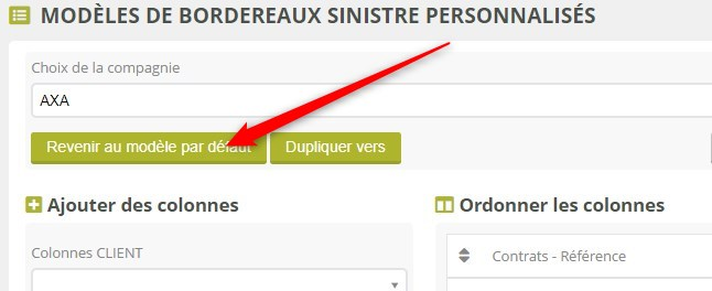 Cliquer sur ce bouton supprime le modèle personnalisé de cette compagnie. Dès lors, elle apparaîtra dans la liste des modèles sous le titre « Utilisent le modèle par défaut », et tous ses bordereaux de sinistres téléchargés au format CSV contiendront les colonnes du modèle par défaut.