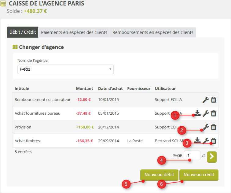 L'interface de gestion des débits et crédits vous permet de visualiser les différentes opérations de la caisse. La liste des agences vous permet de filtrer les opérations afin de n'afficher que celles de l'agence sélectionnée.