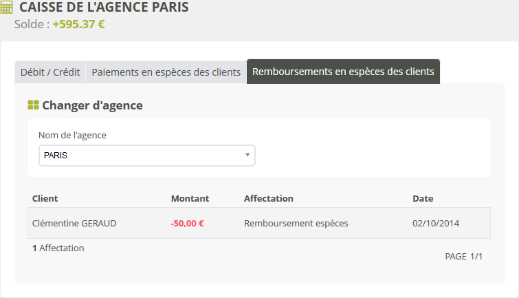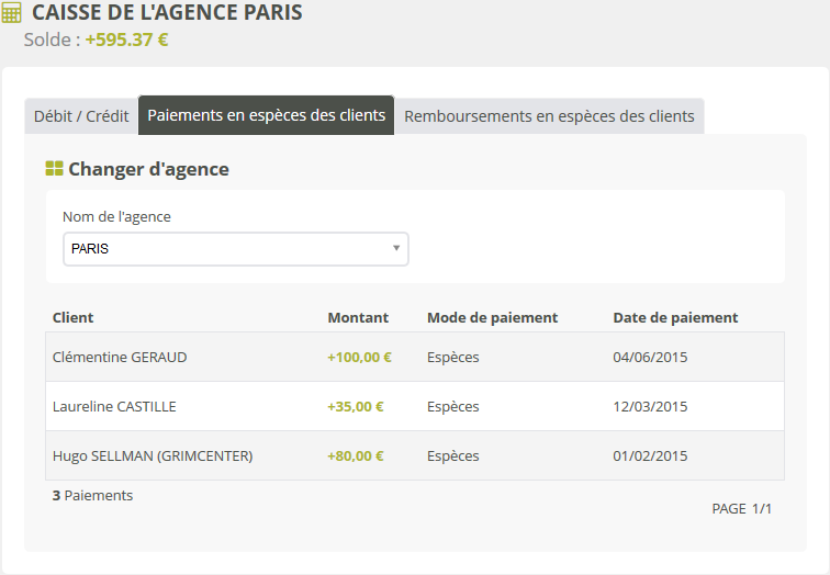 Cette interface vous permet de visualiser les différents paiements en espèces effectués par les clients. Ces éléments ne peuvent pas être modifiés ni supprimés depuis cette page car ces opérations se font depuis la fiche client. La liste des agences vous permet de filtrer les opérations afin de n'afficher que celles de l'agence sélectionnée. Vous pouvez également cliquer sur le nom d'un client pour accéder à sa fiche.