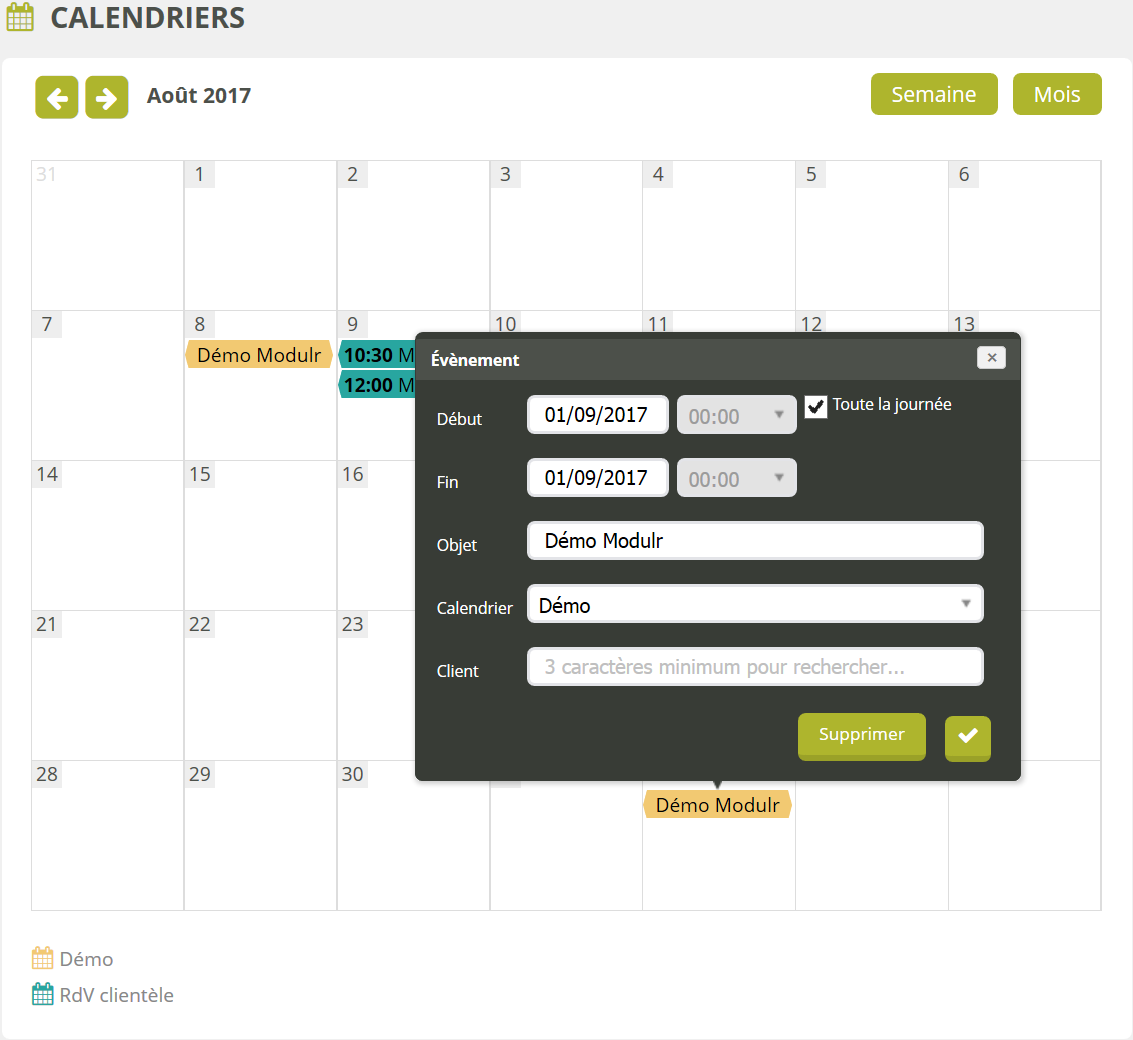 Une fois l'événement ajouté, celui-ci s'affiche dans le calendrier avec la couleur définie pour cet agenda. En cliquant dessus, une fenêtre s'affiche vous permettant de modifier ou de supprimer l'événement.