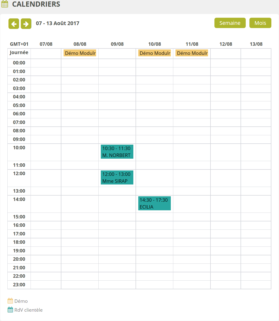 Selon votre formule d'abonnement à Modulr, il est possible de créer un certain nombre d’agendas qui peupleront votre calendrier Modulr. Ces agendas peuvent être synchronisés sur vos tablettes et smartphone mais pas avec Google Agenda et les agendas d'Outlook. Les agendas sont accessibles par les collaborateurs autorisés depuis la zone de notification dans le bandeau en haut à gauche de chaque page de la plateforme.