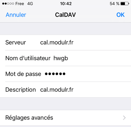 Pour synchroniser vos agendas sur iPhone, rendez-vous dans le menu Réglages / Mots de passes et comptes puis cliquez sur Ajouter un compte. Sélectionnez le type Autre puis Ajouter un compte CalDav et renseignez les informations en suivant la capture d'écran ci-dessous et en remplaçant le nom d'utilisateur par celui affiché dans Modulr Courtage au survol des 3 petites barres sur la ligne de l’agenda que vous souhaitez synchroniser.