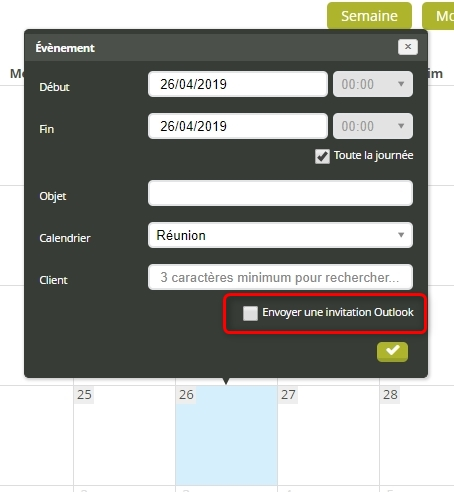 Lorsque vous créez ou modifiez un rendez-vous sur le calendrier, vous avez la possibilité d'envoyer une invitation par email aux différents participants. Pour activer cette fonctionnalité, cochez la case située en bas de la fenêtre de saisie du rendez-vous :