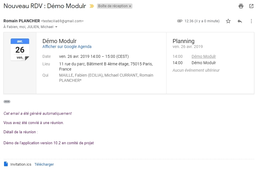En soumettant votre saisie, un email type est envoyé à chaque participant, avec un fichier .ICS en pièce jointe contenant l'invitation.