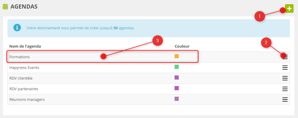 Consulter le nom et la couleur des agendas, tels qu’ils seront affichés dans la section Agendas (voir plus bas pour leur utilisation au quotidien).