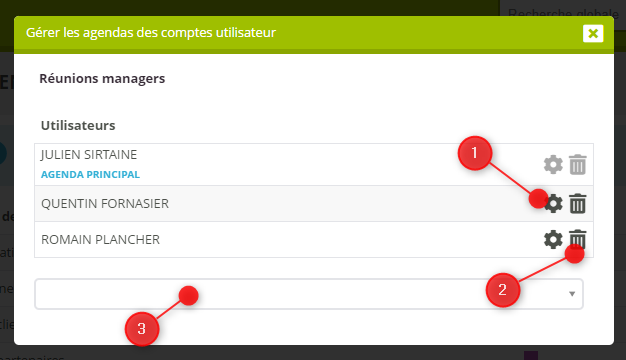 Depuis le menu d’un agenda vous pouvez accéder à une fenêtre de gestion qui permet de donner accès ou de retirer l'accès à chaque collaborateur. Il s'agit d'un accès en lecture et écriture. Par défaut, un nouvel agenda n’est ouvert à aucun collaborateur.