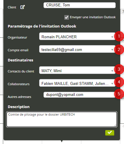 En renseignant les différents champs de saisie proposés, vous pourrez faire parvenir une invitation par email au format .ICS à tous les destinataires sélectionnés. Bien que seul Outlook soit mentionné, ce format est supporté par tous les webmails et clients de messagerie courants. Ainsi, à l'ouverture de l'email, quelle que soit la messagerie utilisée, il sera proposé à l'utilisateur d'enregistrer le RDV dans l'agenda associé à cette messagerie (Outlook, GMail, Yahoo…).