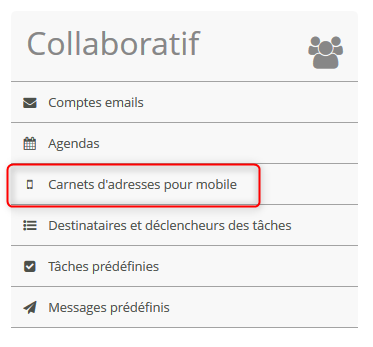 Après avoir activé l'option sur votre compte, vous devriez voir une nouvelle section intitulée Carnets d'adresses pour mobile dans le menu d'administration de la plateforme.