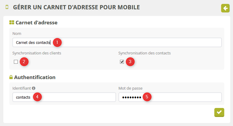 Identifiant : Identifiant utilisé par le téléphone mobile pour s'authentifier auprès du serveur du carnet d'adresse. Attention, cette valeur n'est plus modifiable après la création du carnet. Pour des raisons techniques, la valeur soumise dans ce champ sera automatiquement nettoyée de tous les caractères spéciaux et espaces qu'elle contient.