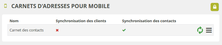 Après la validation du formulaire, la synchronisation du nouveau carnet d'adresse sera lancée. Elle est symbolisée par un symbole de rafraichissement vert sur la ligne du carnet d'adresse, juste à côté du menu déroulant.