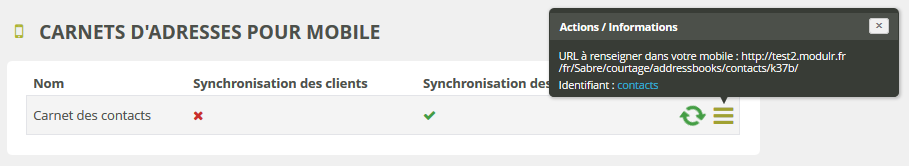 Cette synchronisation s'effectue via une tâche planifiée, elle n'est pas immédiatement exécutée. Il peut y avoir un délai entre le moment ou le carnet d'adresse est créé et le moment où le carnet d'adresse est synchronisé. Quand le carnet d'adresse est en cours de synchronisation, il n'est ni modifiable, ni supprimable. Pour que les contacts apparaissent dans le téléphone mobile, il faut que le carnet d'adresse ait terminé sa synchronisation.
