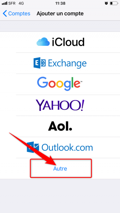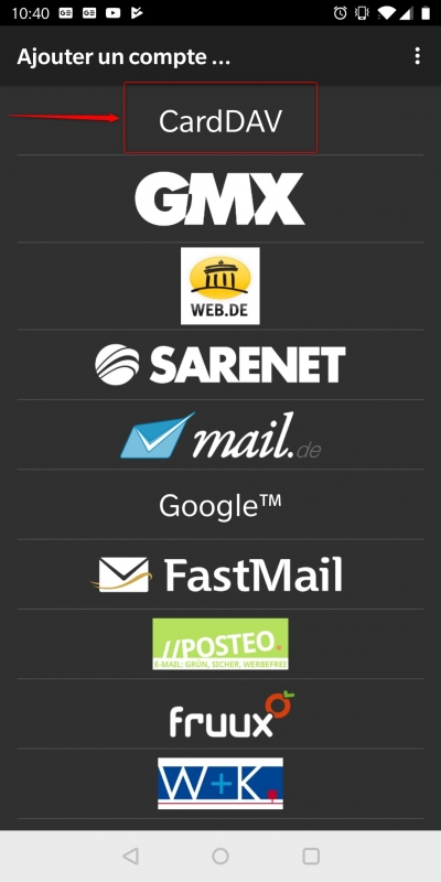 La liste des applications proposées à la synchronisation n'affichera probablement pas CardDav. Si tel est le cas, choisissez “Autre”, puis “Ajouter un compte CardDav”.