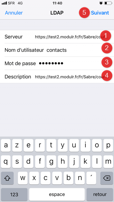 Mot de passe : Mot de passe utilisé par le téléphone mobile pour s'authentifier auprès du serveur du carnet d'adresse.