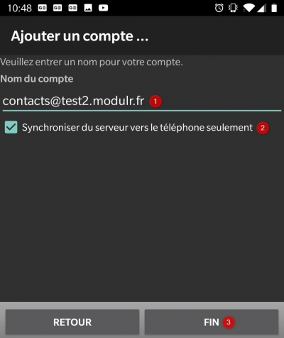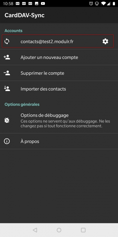 Constatez la création du compte. Vous pouvez, en entrant dans les options du compte, forcer la synchronisation du carnet sur votre mobile. En théorie, la synchronisation se fait à intervalles régulières par l'application.