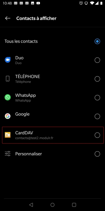 Rendez-vous ensuite dans votre application “Contacts” et assurez-vous que le Groupe portant le nom de votre compte CardDav soit bien activé. Vérifiez alors la présence de vos contacts CardDav.