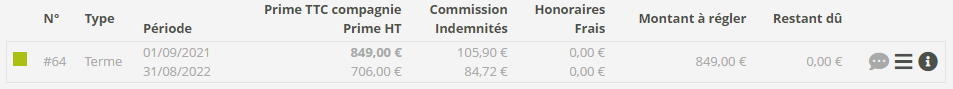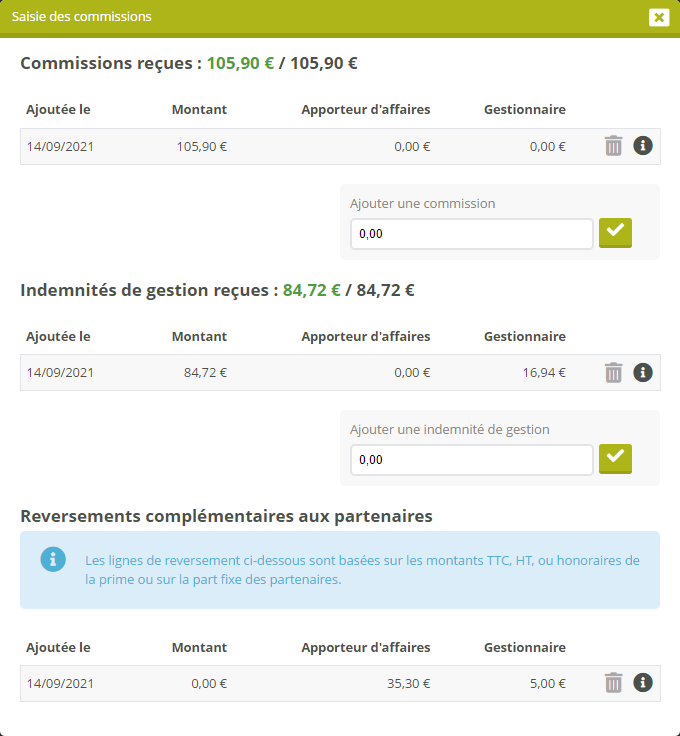 Marquer la quittance comme payée à la compagnie, ce qui va insérer une première ligne de commission de 20€ avec l'éventuelle part apporteur et/ou gestionnaire. Cette ligne n’est pas modifiable.
