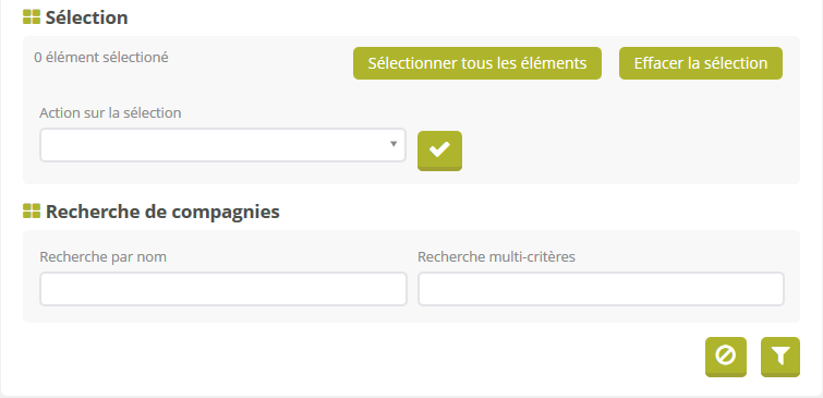 Un encart de sélection vous permet d'opérer une action sur une ou plusieurs compagnies (préalablement sélectionnées). Selon les options activées sur votre plateforme, les actions possibles sur les compagnies sont :