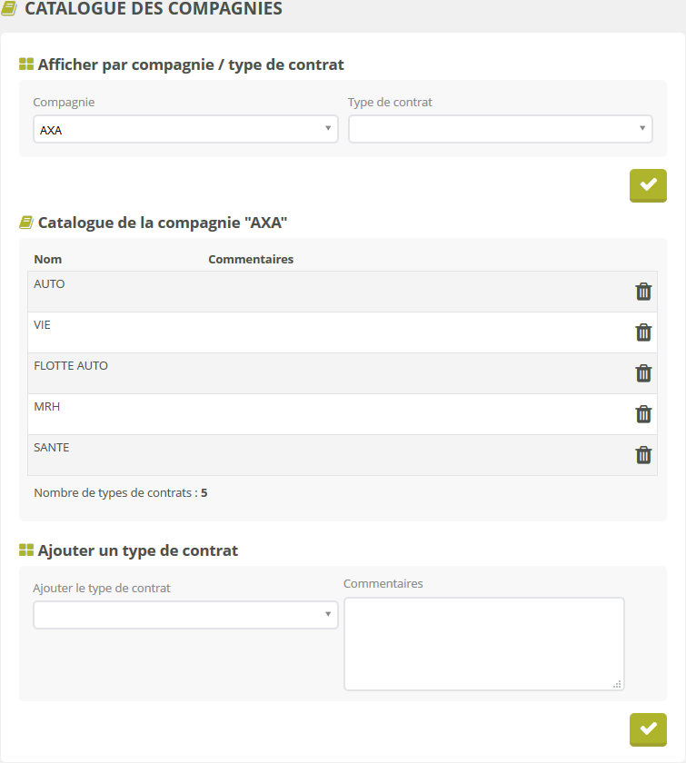 Supprimer une association entre un type de contrat et une compagnie (icône poubelle).