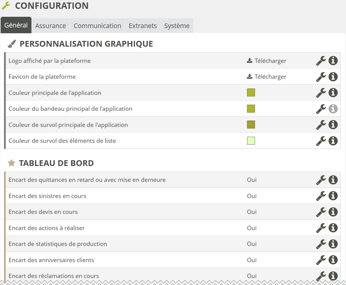 Les options de configuration sont découpées en onglets thématiques et par fonctionnalités. Vous pouvez activer / désactiver certaines options qui font apparaître / disparaître des menus ou onglets, personnaliser l'interface (couleurs et logos), personnaliser le tableau de bord, etc.