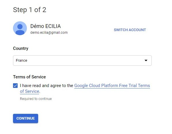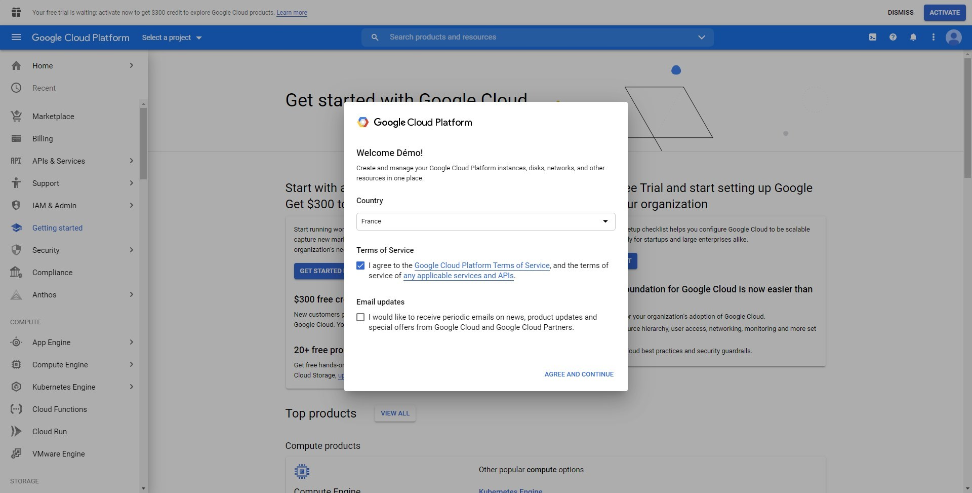 Acceptez les conditions d’utilisation de Google Cloud et validez votre compte.