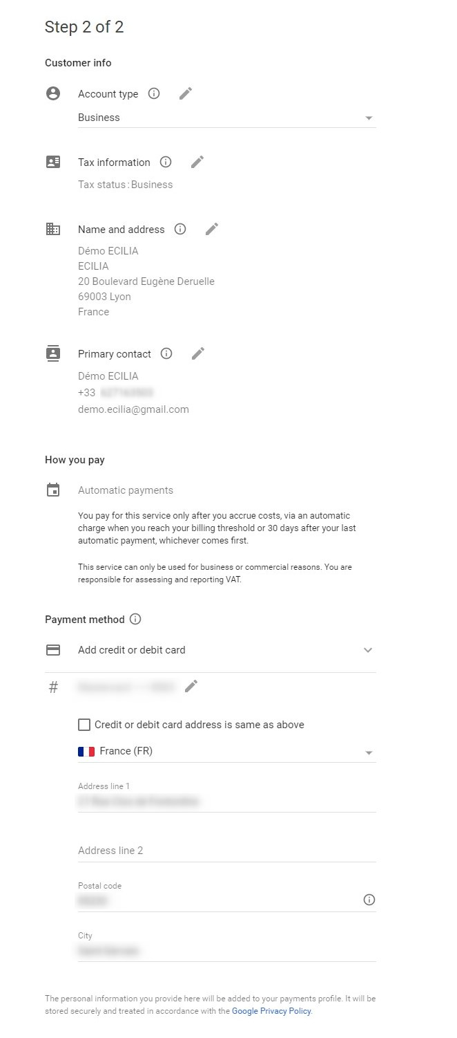 Cliquez sur “Create account” pour ajouter un nouveau compte de facturation. Choisissez le mode de paiement de votre choix, et renseignez les données et contacts de facturation.
