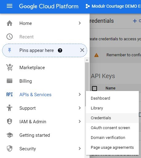 Il faut maintenant créer votre clé secrète d’API, qui permettra à Modulr Courtage d’exploiter ces services. Rendez-vous dans le menu « APIs & Services » et cliquez sur Credentials.