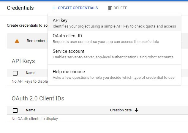 Cliquez sur « + Create credentials » en haut de page puis sur « API Key ».