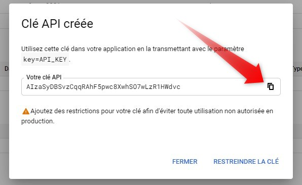 Ne vous préoccupez pas du bouton « Restrict Key » : il permet de configurer des restrictions d'usage sur votre clé API, mais ces restrictions ne sont pas compatibles avec les services Maps que nous cherchons à activer.