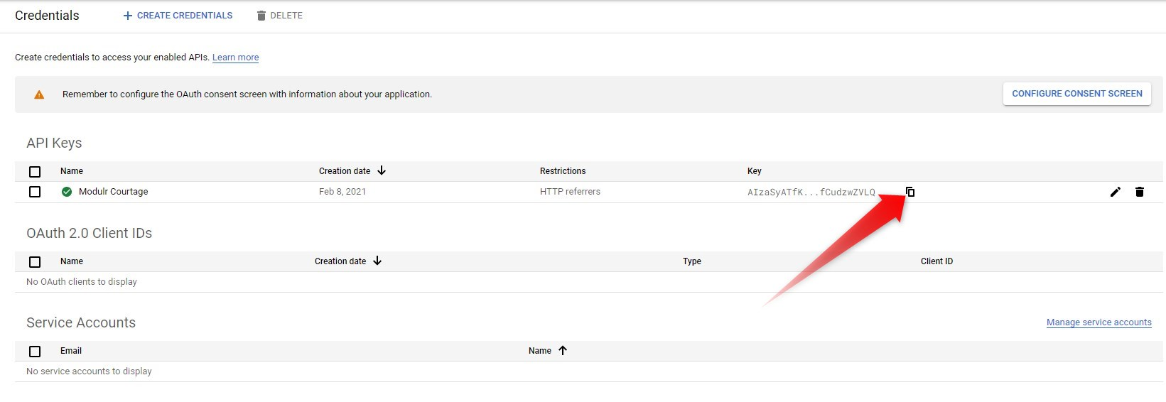 Il ne reste plus qu’à renseigner votre clé API dans Modulr pour terminer ce raccordement. Utilisez le bouton « copie » situé à droite de votre clé. Cela copie la clé dans votre presse-papier.
