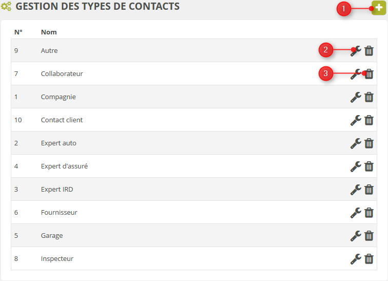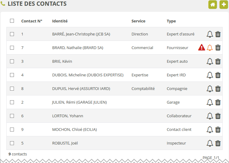 La plateforme permet de gérer un annuaire de contacts. Les contacts sont des fiches pouvant être rattachées à d'autres fiches (clients, compagnies, apporteurs d'affaires) ou aux sinistres (expert, garage, tiers, …).