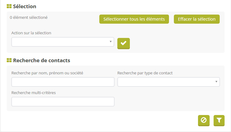 Un encart de sélection vous permet d'opérer une action sur un ou plusieurs contacts (préalablement sélectionnés). Selon les options activées sur votre plateforme, les actions possibles sur les contacts sont :
