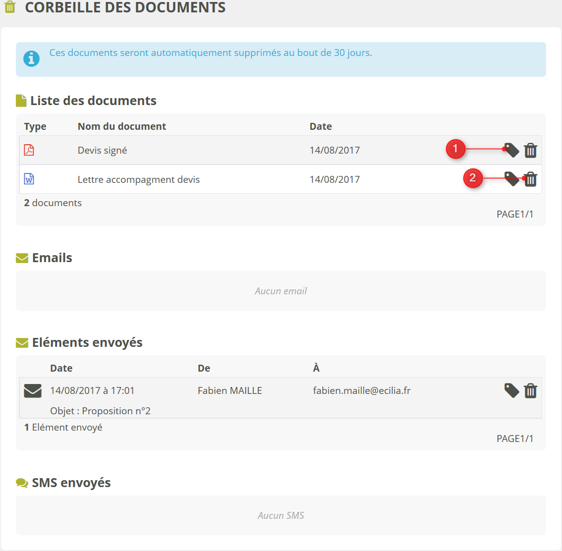 La corbeille affiche la liste des documents, emails reçus, emails envoyés et SMS envoyés qui ont été supprimés ou qui ne sont plus associés à aucune fiche clients / contacts / etc. Ces éléments supprimés restent accessibles et peuvent être restaurés jusqu'à 30 jours après leur suppression. Une fois ce délai passé, ils sont automatiquement et définitivement supprimés.